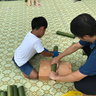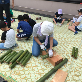 夏休みも終盤にさしかかった8月21日児童センターに通う子どもたち16人と職員3人が公民館に来てくれて、公民館、ひろば職員みんなで竹をつかった食器作り&カレー会をやりました。